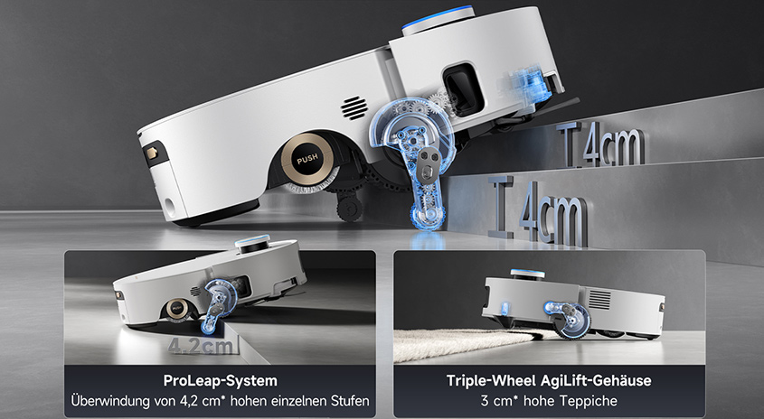 Mit dem ProLeap™-System meistert der Saugroboter Hindernisse bis zu 8 cm Höhe, wie Türschwellen oder Teppichkanten und sorgt für eine reibungslose Reinigung in allen Bereichen. Dank der VersaLift-Navigation erreicht er mühelos niedrige Zwischenräume ab 89 mm, wie unter Sofas oder Betten. Intelligente Technologie und durchdachtes Design garantieren eine effiziente und gründliche Reinigung deines Zuhauses.