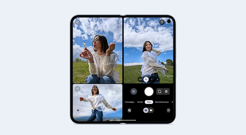Erledige Dinge, die nur mit dem Pixel Fold-Kamerasystem möglich sind. Sieh dir zum Beispiel Bilder an, während du sie aufnimmst.