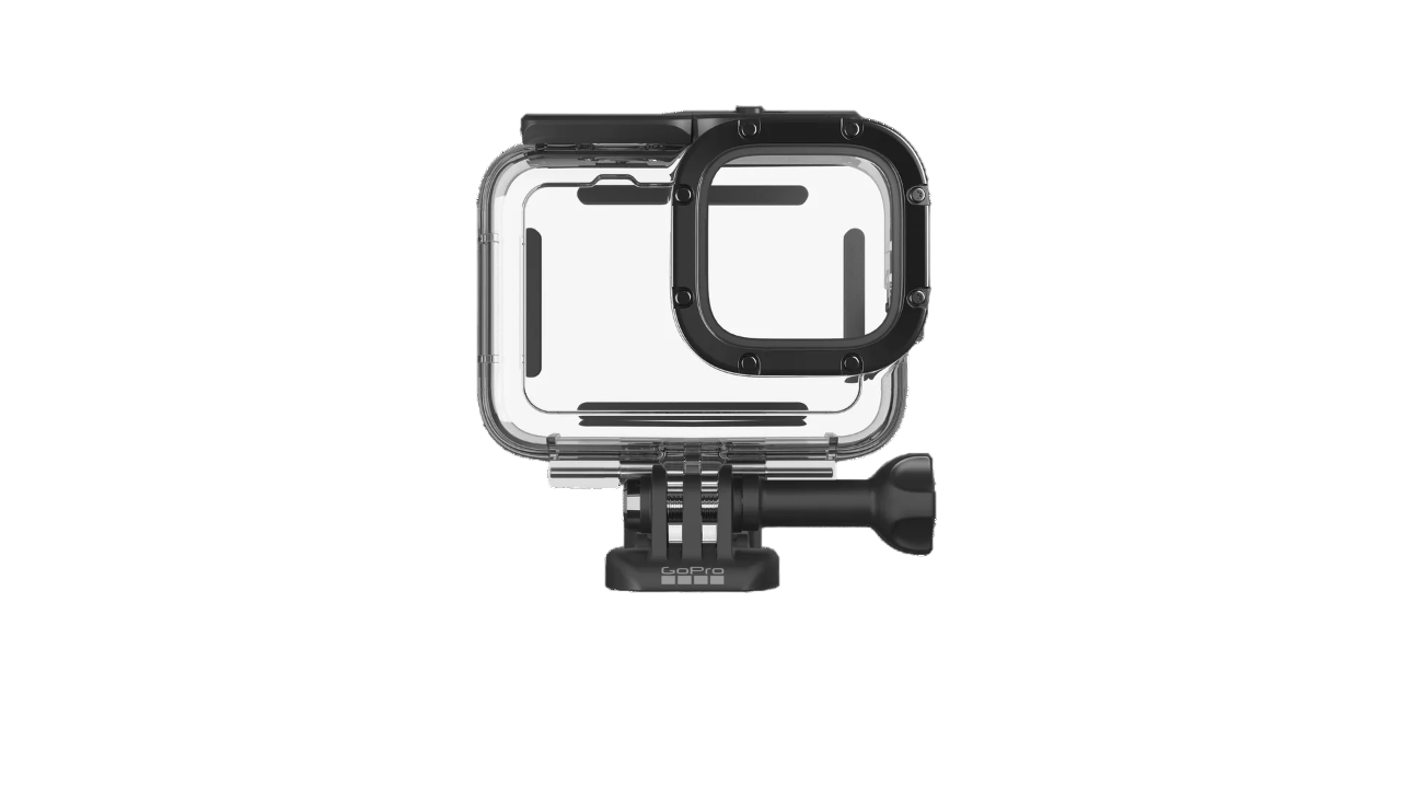 Schutzgehäuse, Skeleton-Gehäusedeckel, Befestigungsclip und Flügelschraube (GoPro Actionkamera ist nicht im Lieferumfang enthalten)