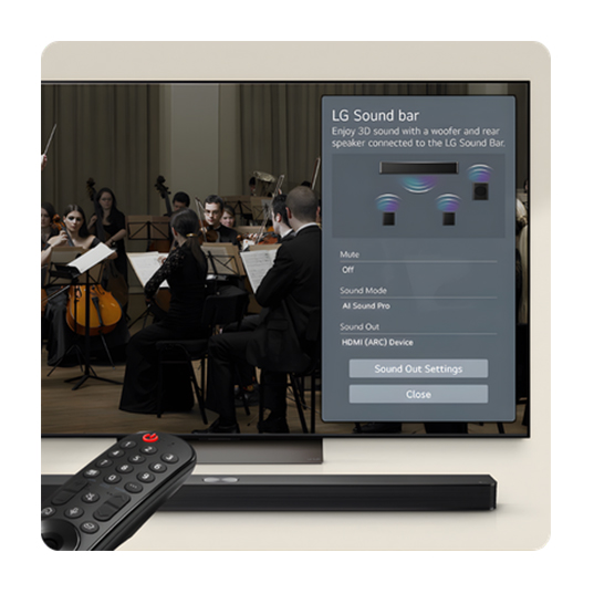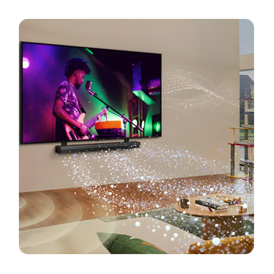 Mit WOW Orchestra spielen Soundbar und LG Fernseher perfekt zusammen und erzeugen gemeinsam eine größere, kraftvollere Klangkulisse. Für ein immersives Audioerlebnis, das dich mitten ins Geschehen versetzt.