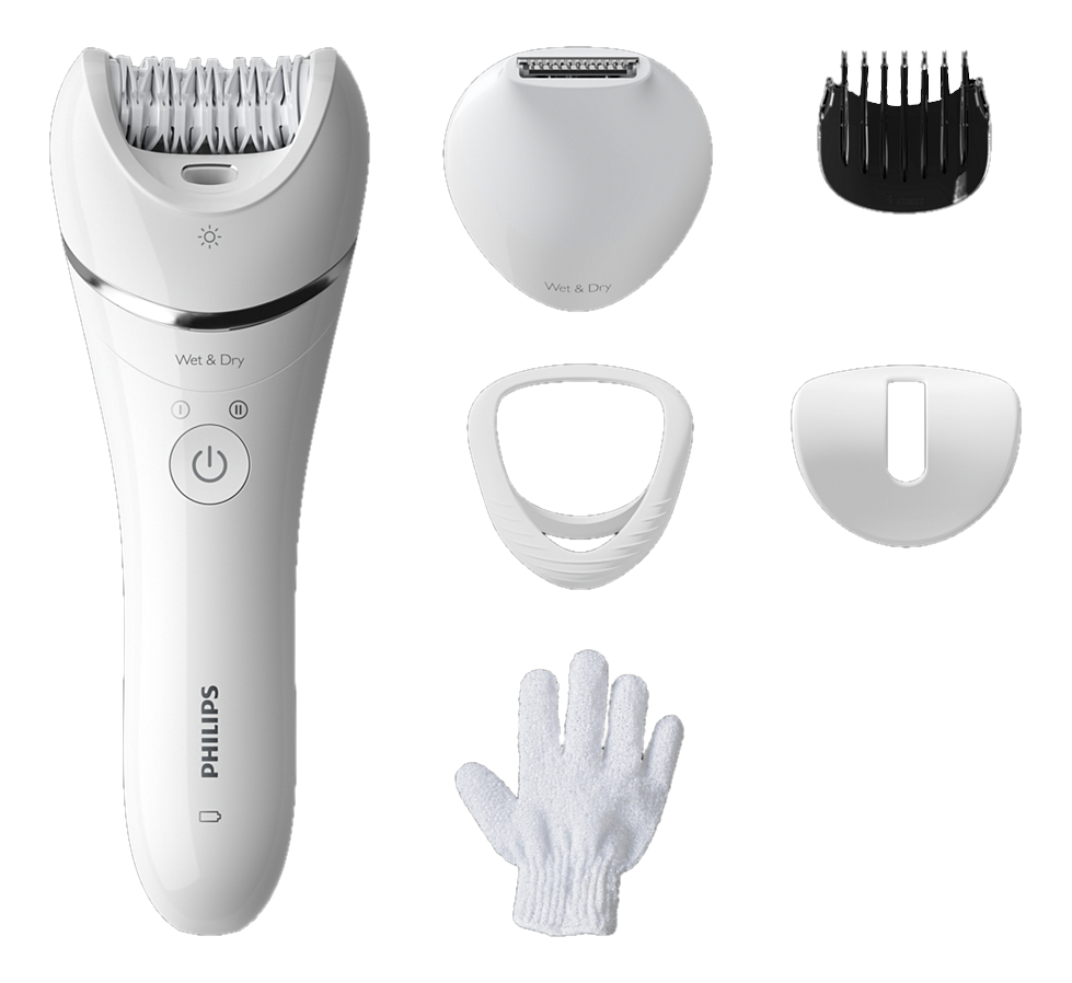 Epilierer, Scherkopf für Bikinizone, Bikini-Trimmerkamm, Körperpeeling-Handschuh, Aufsatz für empfindliche Stellen, Aufsatz für optimalen Hautkontakt, Aufbewahrungsetui, Reinigungsbürste