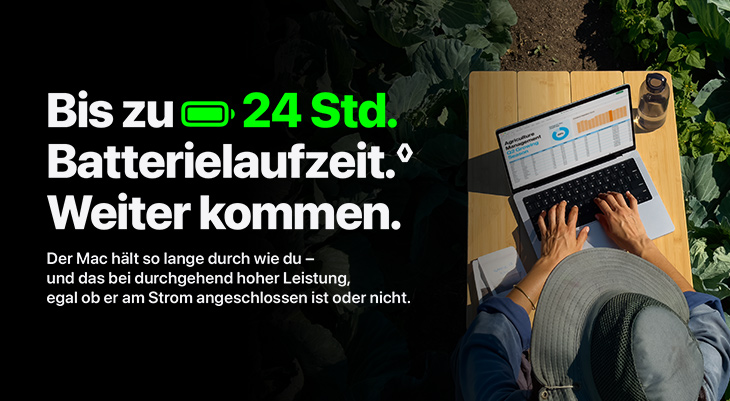 Die Tests wurden von Apple im August und September 2024 durchgeführt mit Prototypen von Magic Keyboard (USB C) Geräten, Firmware und Software gekoppelt mit Prototypen von 24" iMac Systemen mit Apple M4. Bei den Tests wurde die Batterie vollständig entladen, während das Gerät mit einem iMac gekoppelt war und mit automatischem Equipment verwendet wurde. Die Batterielaufzeit hängt von den Geräte-Einstellungen, der Verwendung und weiteren Faktoren ab.