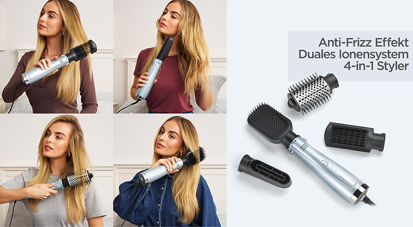 Die 38-mm-Bürste verleiht Fülle, die rotierende 50-mm-Keramikbürste kreiert maximales Volumen, die keramikbeschichtete Paddle Brush bringt Glanz und Geschmeidigkeit, und der Glättungsaufsatz sorgt für ein besonders glattes Finish. Mit der integrierten Ionen-Technologie wird Frizz reduziert und ein hochglänzendes Ergebnis erzielt.