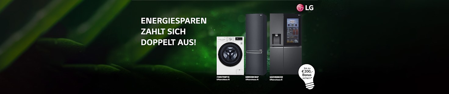 Jetzt mit den neuen energieeffizienten LG Haushaltsgeräten Energiekosten senken & zusätzlich LG Energiebonus bis zu € 200,- sichern.