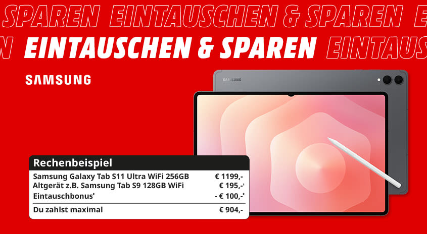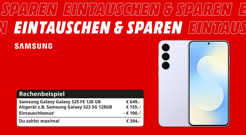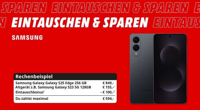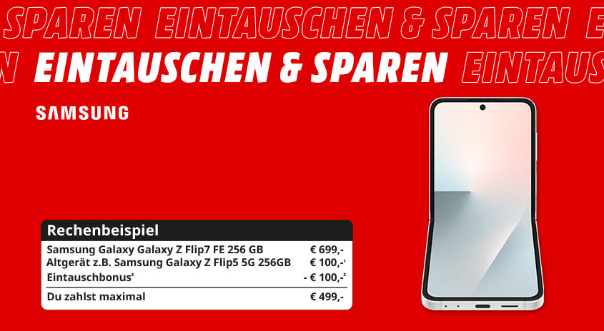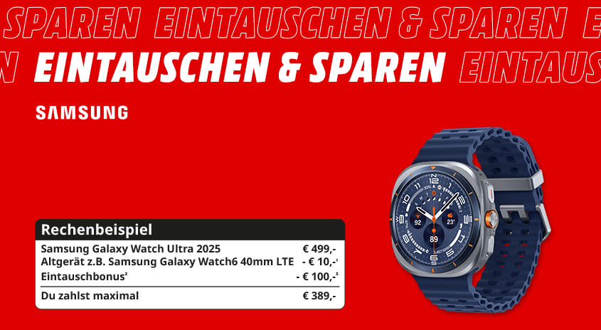 ²Bei Kauf eines der nachfolgend angeführten Geräte in einem MediaMarkt in Österreich oder unter mediamarkt.at (Käufe bei Drittanbietern jeweils ausgenommen) zwischen dem 07.12. und 24.12.2025, 23:59 Uhr und gleichzeitiger Nutzung des Trade-In Service für dein gebrauchtes Smartphone erhältst du zum Ankaufswert deines Gebrauchtgeräts zusätzlich 100,- Ankaufprämie für folgende Geräte: Galaxy Flip7 FE (128, 256GB), Galaxy Flip7 (256, 512GB), Galaxy S25 Edge (128, 512GB), Galaxy S25 FE (128, 256, 512GB), Galaxy Tab S11 Ultra WiFi (256, 512GB), Tab S11 Ultra 5G (256, 512GB) oder Galaxy Watch Ultra 2025 . Voraussetzung für den Ankauf ist die Angabe der IMEI- oder Seriennummer des Gebrauchtgerätes. Der Ankaufspreis für das Gebrauchtgerät ist abhängig vom Modell und Zustand und wird im Markt bzw. nach Onlineeinsendung ermittelt. Bei Kauf und Abgabe im Markt: Direktabzug der Ankaufsprämie vom ausgewiesenen Verkaufspreis des Neugeräts. Der ermittelte Gebrauchtgerätewert kann von Kaufpreis des Neugeräts abgezogen werden oder als MediaMarkt-Geschenkkarte ausgegeben werden (Geschenkkarte nicht einlösbar für Käufe bei Drittanbietern. Keine Guthabenverzinsung. Herausgeber: MediaMarkt Österreich GmbH, SCS Bürocenter B2, 2334 Vösendorf). Bei Online-Kauf und Nutzung des Online Trade-In Service: Überweisung der Ankaufsprämie und des ermittelten Gebrauchtgerätewerts nach Onlineregistrierung unter https://ankaufservice.mediamarkt.at/campaigns/
