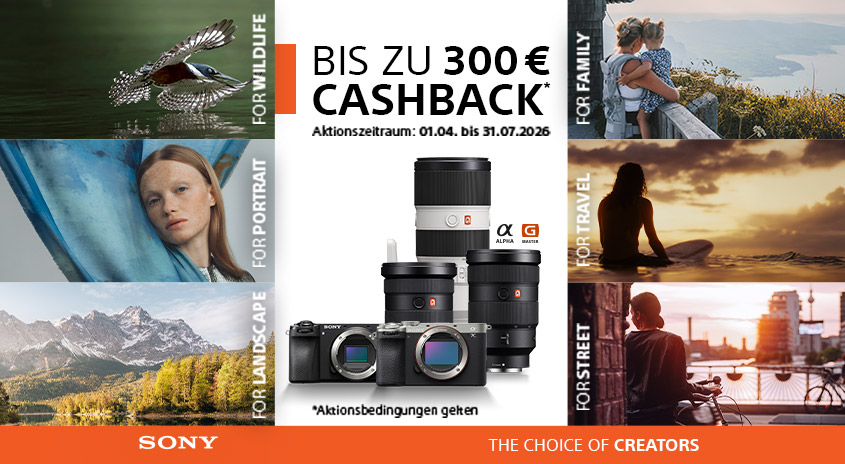 Jetzt warten ausgewählte Kameras, Objektive und Zubehör zum Top-Preis auf dich- denn beim Kauf von Aktionsmodellen bis 31. Juli 2026 gibt's bis zu € 300,- Cashback!