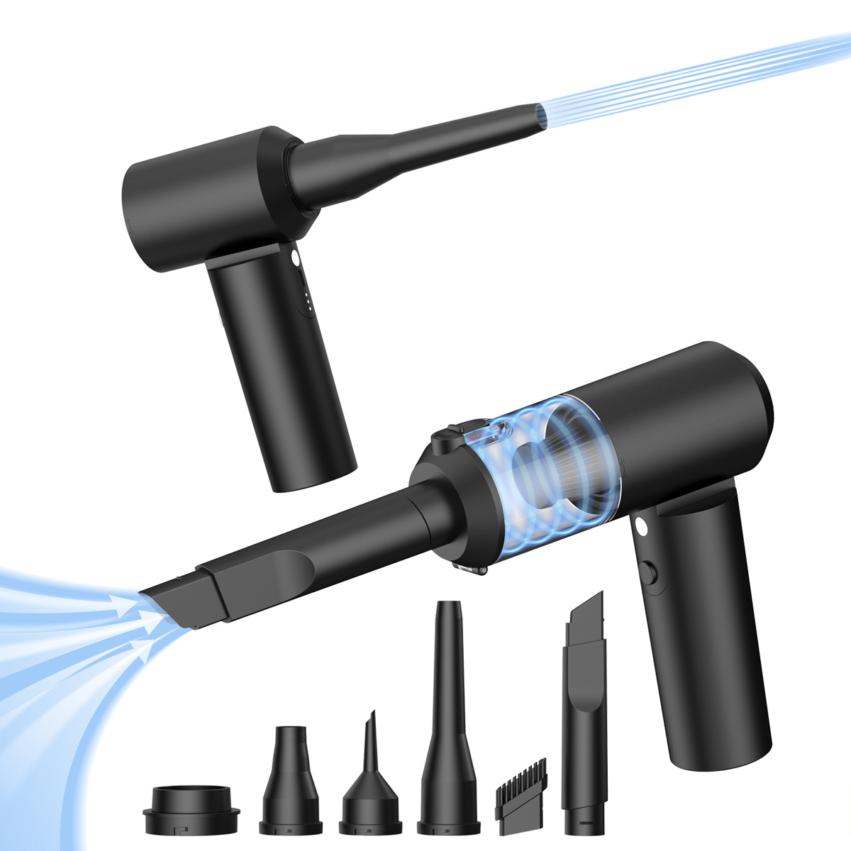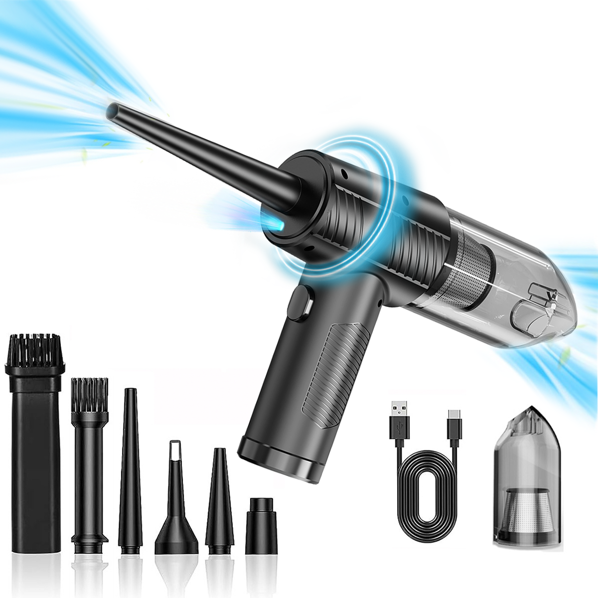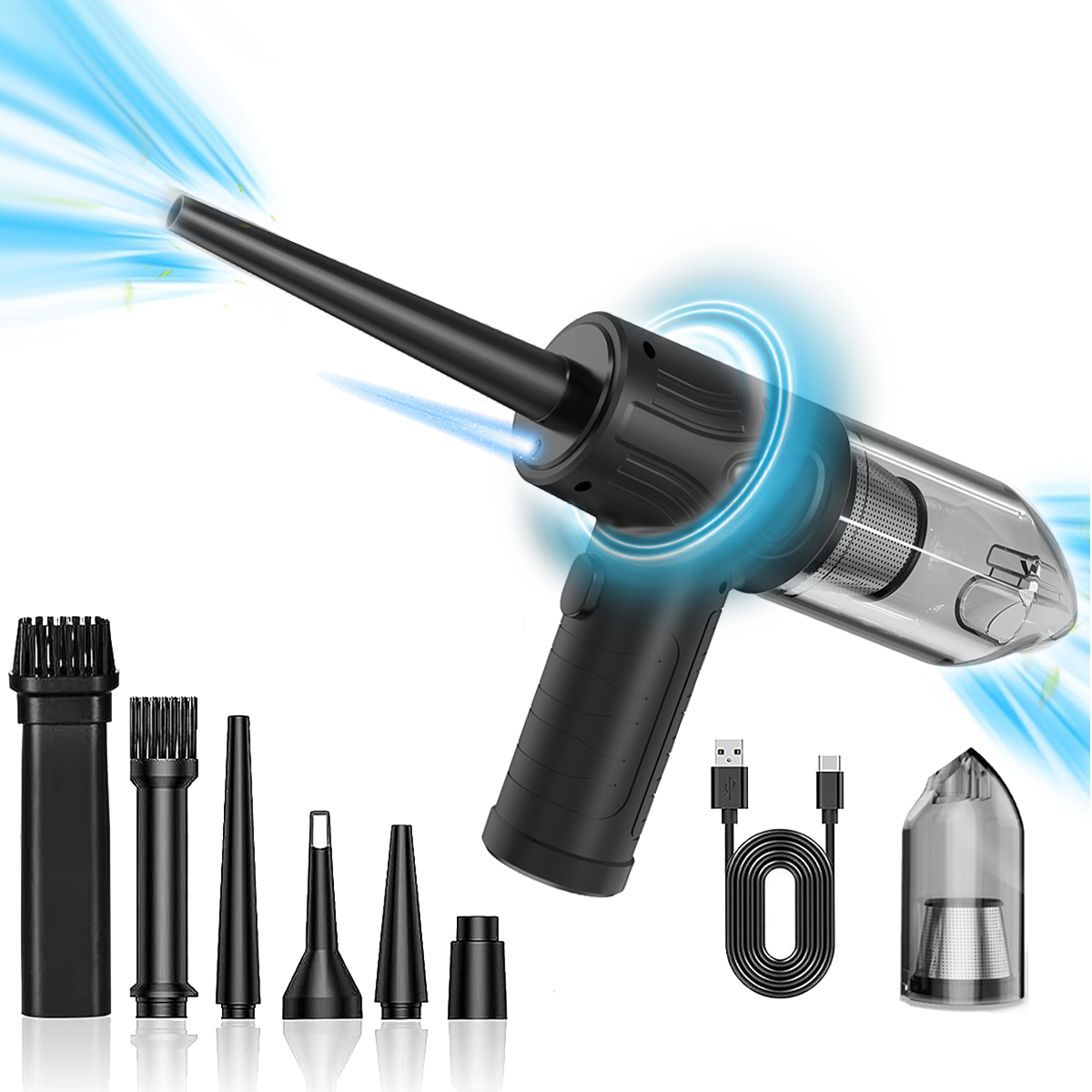Handstaubsauger, Fugendüse, Bürstendüse, Gebläsedüse, Aufblasdüse, Vakuumdüse, USB-C-Ladekabel, Anleitung