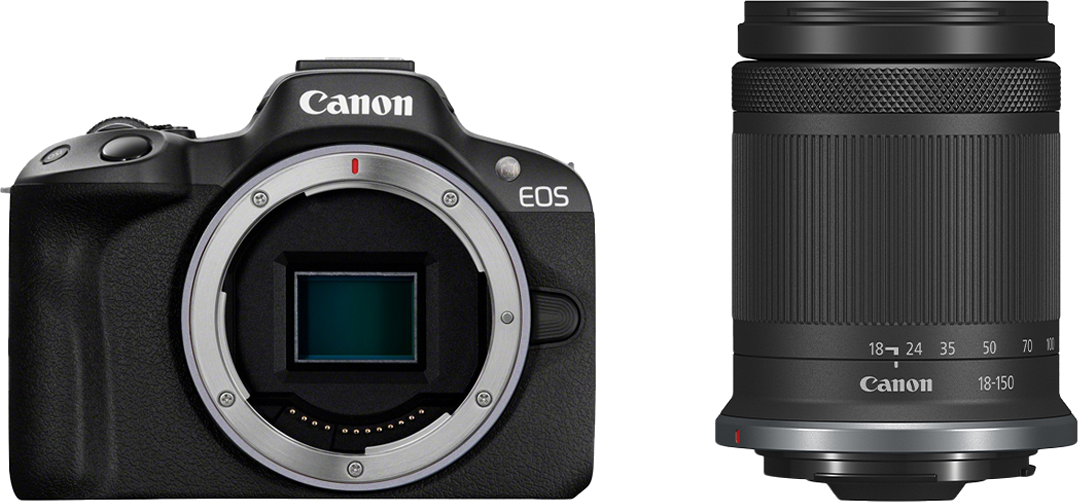 EOS R50 spiegelloses Kameragehäuse Schwarz, RF-S 18-150mm F3.5-6.3 IS STM Objektiv, RF-S 18-150mm F3.5-6.3 IS STM, Objektivdeckel E-55, Objektivrückdeckel RF, Benutzerhandbuch