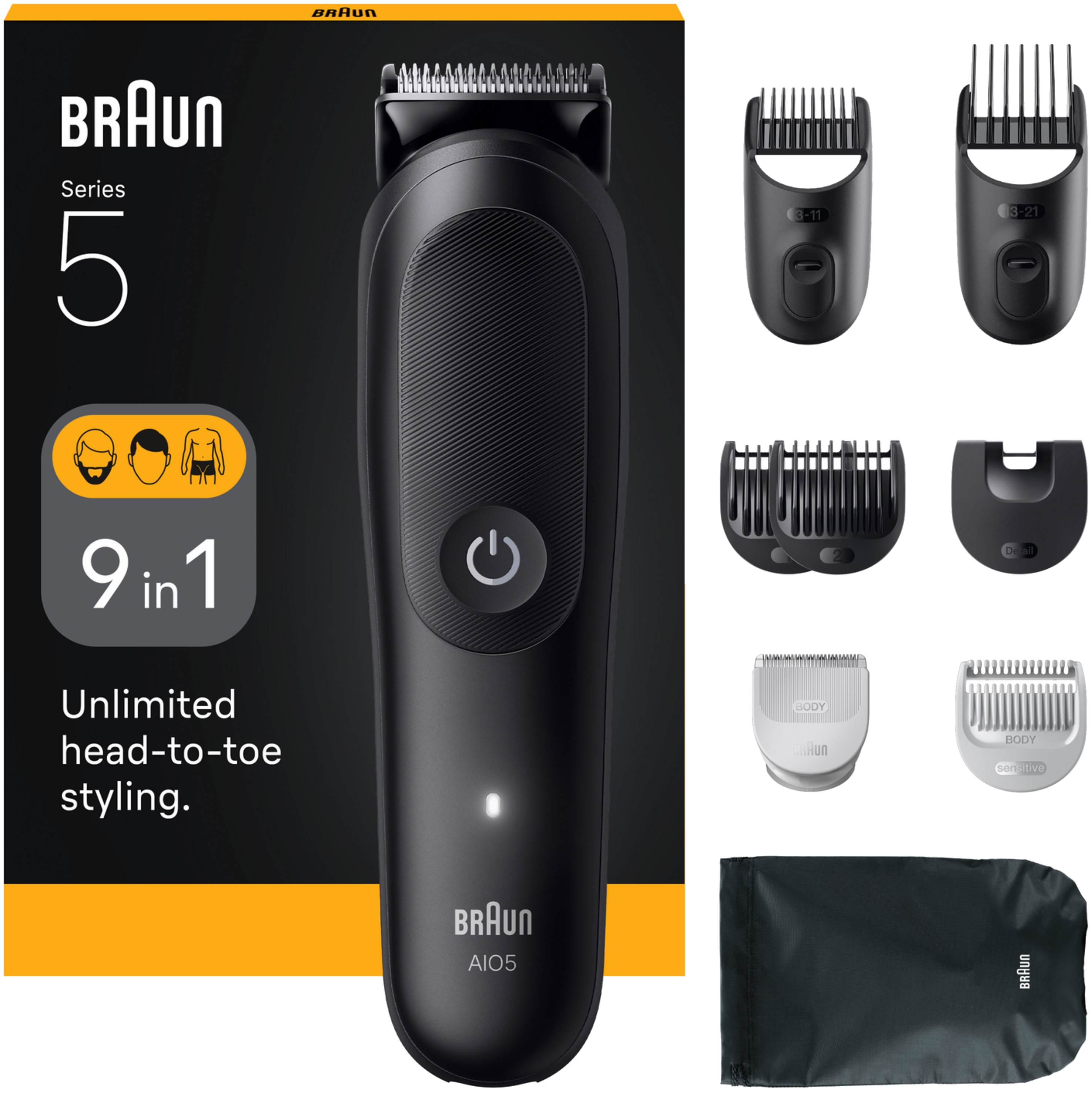 1 Trimmer, 6 Kammaufsätze, 1 SkinGuard-Trimmer, 1 Reinigungsbürste, 1 Tasche