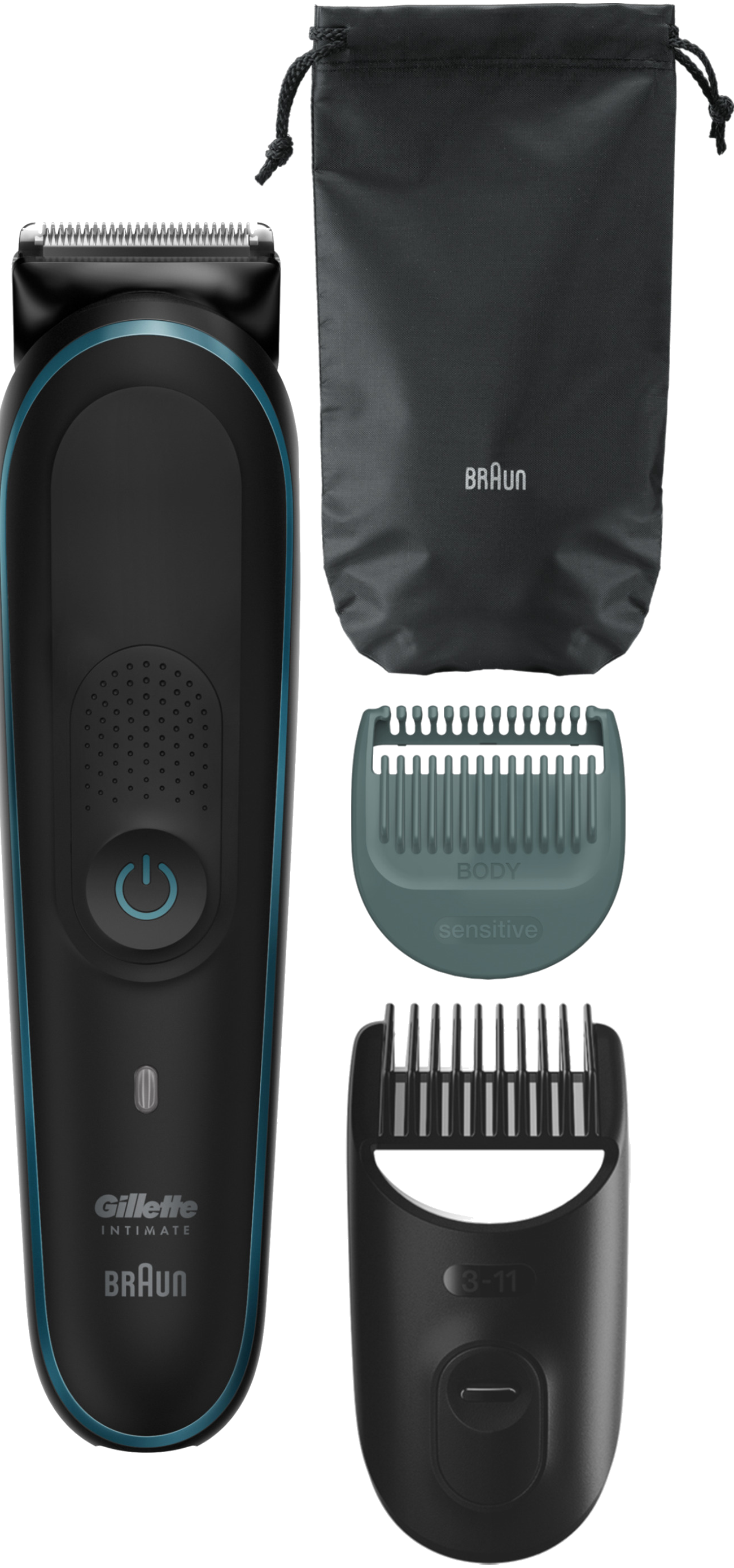1x Trimmer 1x Metall-Trimmeraufsatz 1x Bodygroomer-Aufsatz 1x Detail-Trimmerkopf 1x Trimmeraufsatz für Ohren- und Nasenhaare 1x Verschiebbarer Bartkammaufsatz (3 – 11 mm) 1x Verschiebbarer Haarkammaufsatz (13 – 21 mm) 1x Fester Standard-Kammaufsatz (1 mm) 1x Fester Standard-Kammaufsatz (2 mm) 1x Sensitiv-Kammaufsatz 1x Augenbrauen-Kammaufsatz 1x Gillette ProGlide Rasierer 1x Gillette ProGlide Ersatzklinge 1x Reinigungsbürste 1x Ladestation 1x Aufbewahrungstasche