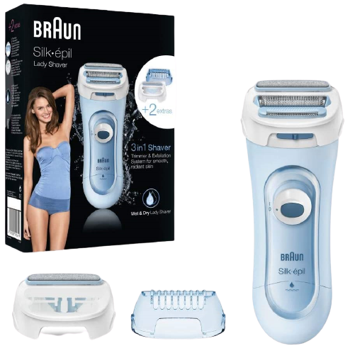 1x Damenrasierer, 1x Trimmeraufsatz, 1x Peeling-Aufsatz, Bedienungsanleitung
