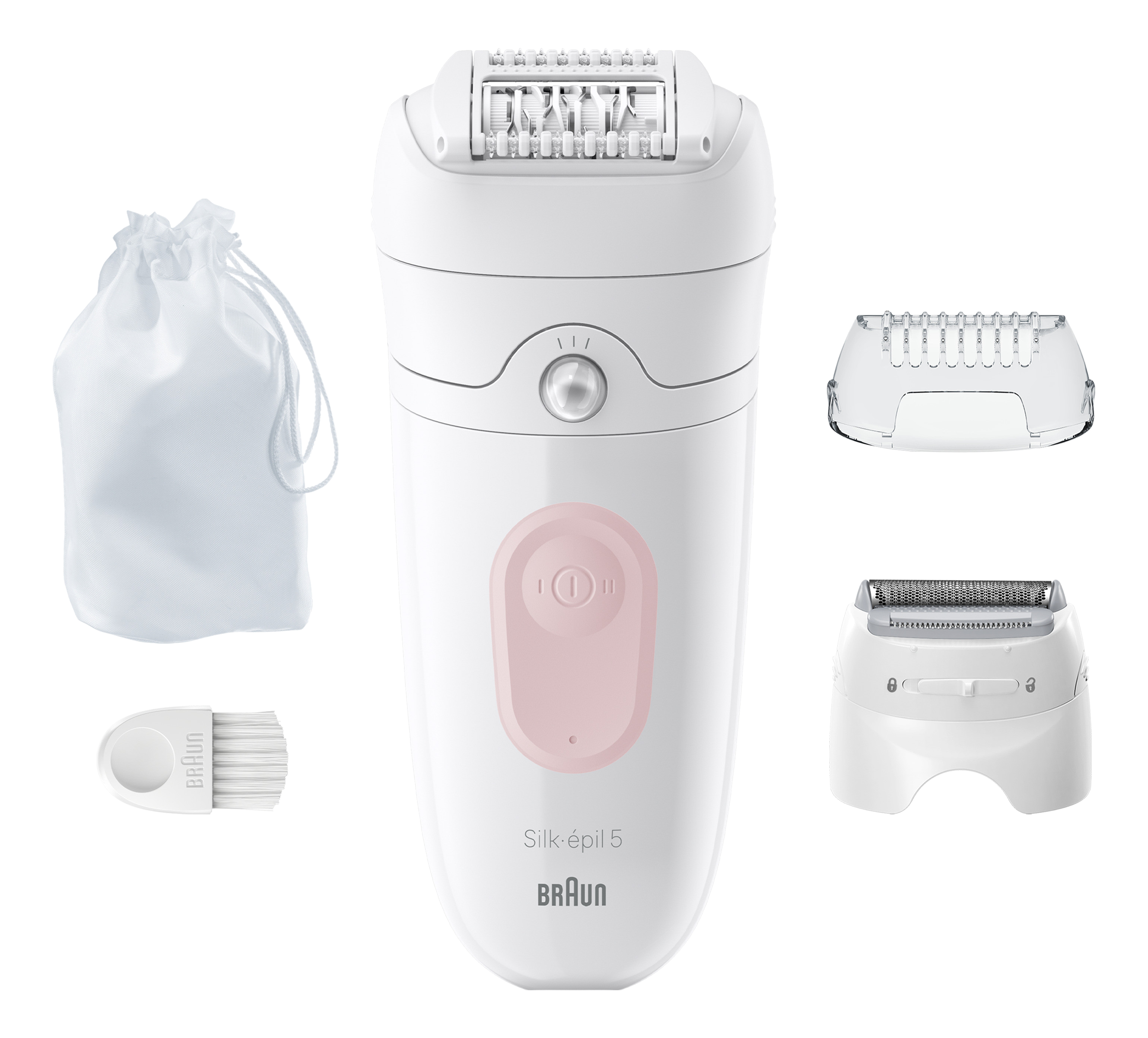 Braun Silk-épil 5, Massagerollen-Aufsatz, Rasieraufsatz, Trimmeraufsatz, Aufbewahrungsbeutel, Reinigungsbürste, Ladegerät