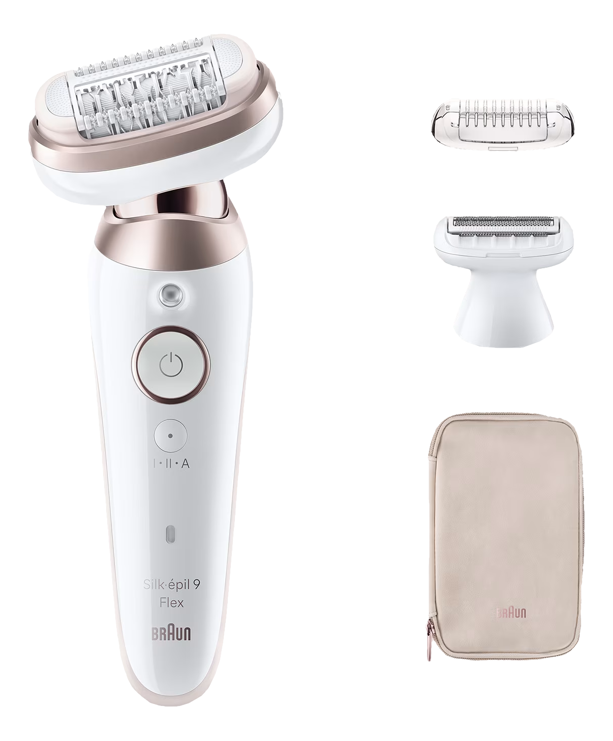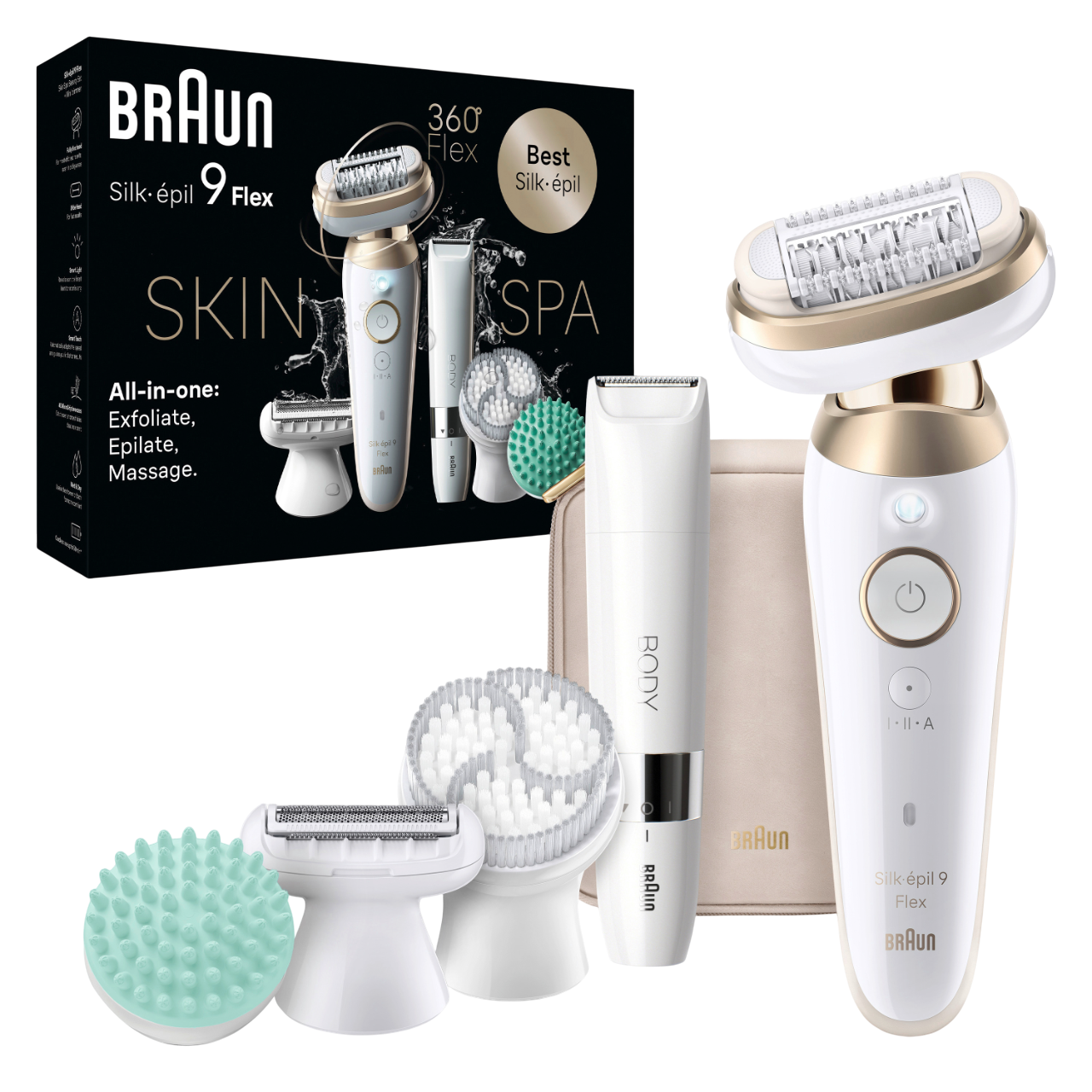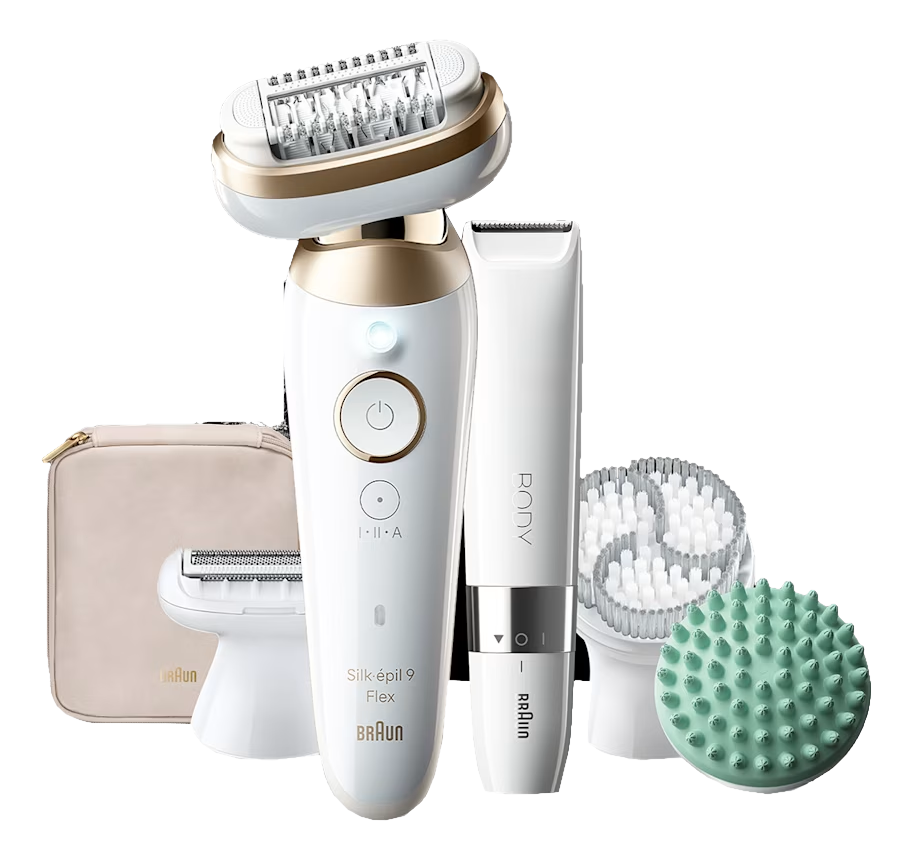 Silk·épil 9 Flex 3D Epilierer, Körperpeeling-Bürste, Schutzkappe, Rasieraufsatz, Trimmeraufsatz, Aufsatz für optimalen Hautkontakt, Mini-Körpertrimmer, Reinigungsbürste, Ladekabel, Aufbewahrungstasche