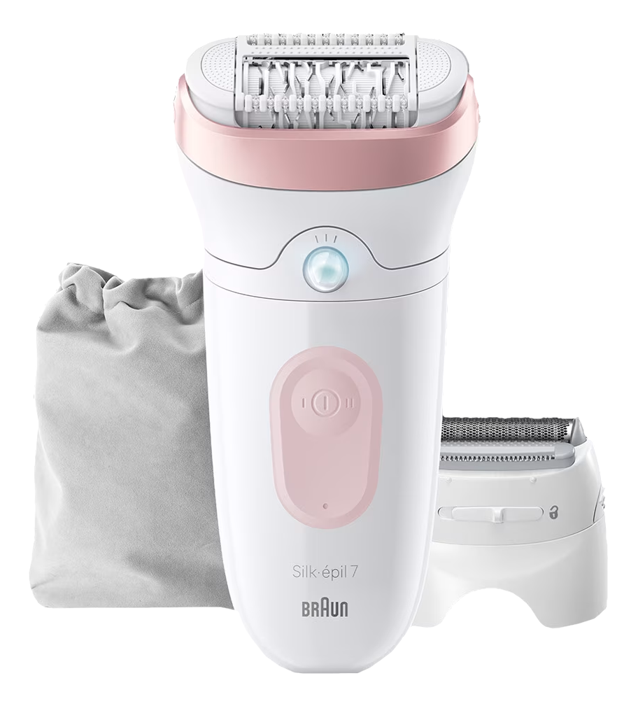 Silk·épil 7 Epilierer, Rasieraufsatz, Trimmeraufsatz, Reinigungsbürste, Intelligenter Aufsatz, Hochwertiger Kordelzugbeutel