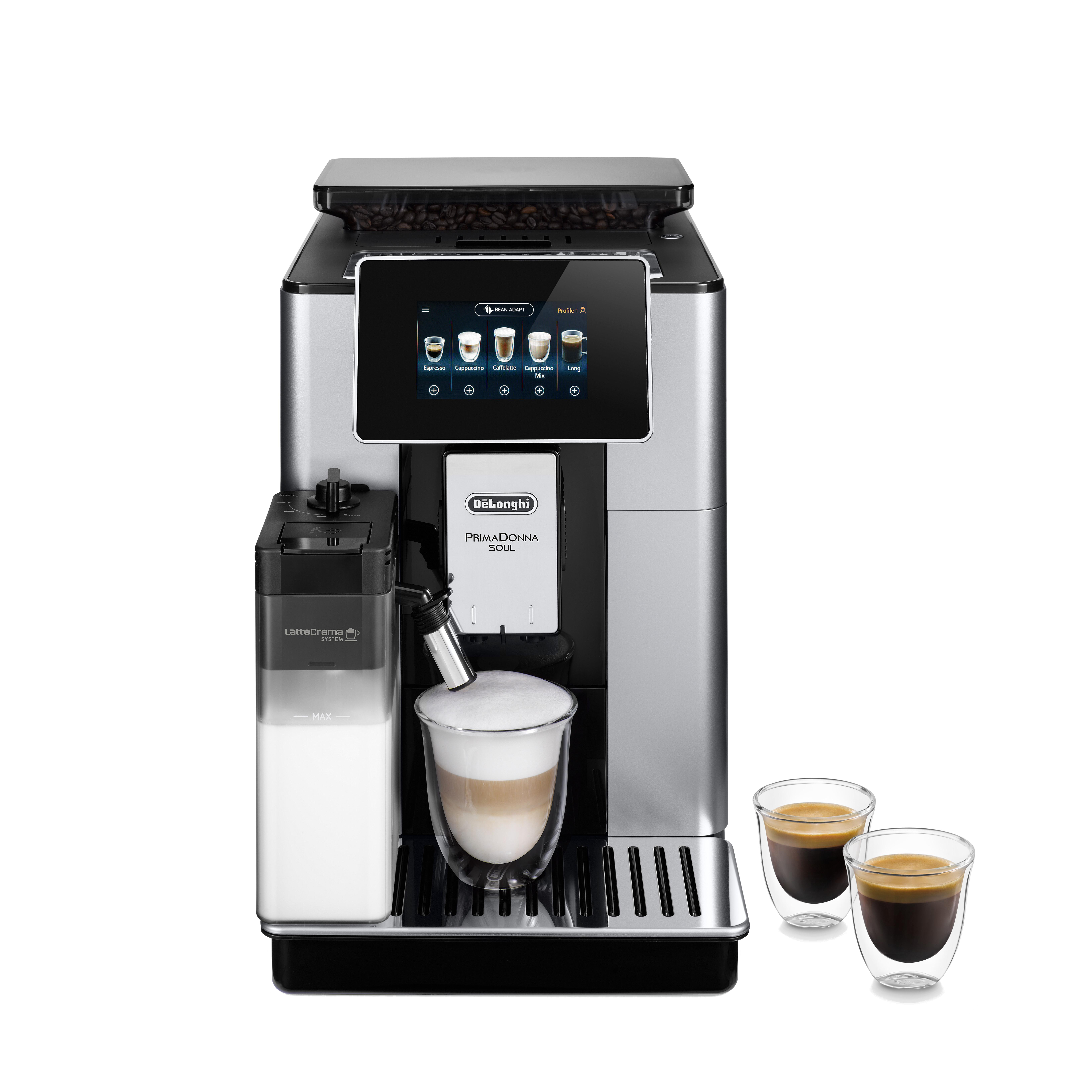 DE LONGHI ECAM 610.55 SB Prima Donna Soul Kaffeevollautomat (Silber Schwarz, Flüster Kegelmahlwerk, 19 bar, integrierter Milchbehälter)