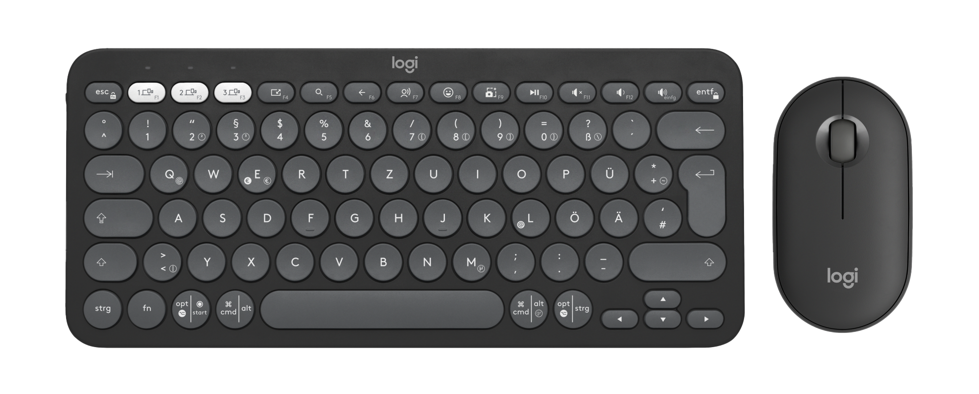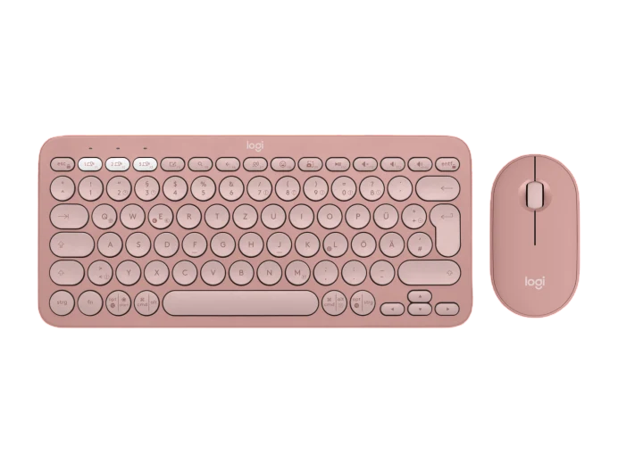 Pebble Keys 2 K380s Tastatur, 2 AAA-Batterien (bereits eingelegt), Pebble Mouse 2 M350s, 1 Alkali-Batterie vom Typ AA (bereits eingelegt), Bedienungsanleitung, Logi Bolt Empfänger, Dokument „Wichtige Informationen“ (IID)