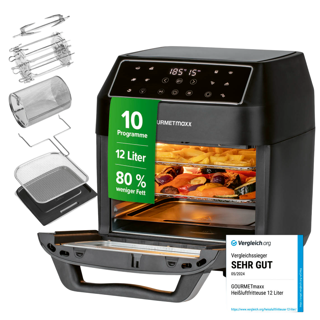Heißluftfritteuse, 3 Grillgitter, 10 Schaschlikspieße, 1 Hähnchendrehspieß, 1 Drehkorb, 1 Abnehmbarer Griff + Fettauffangschale
