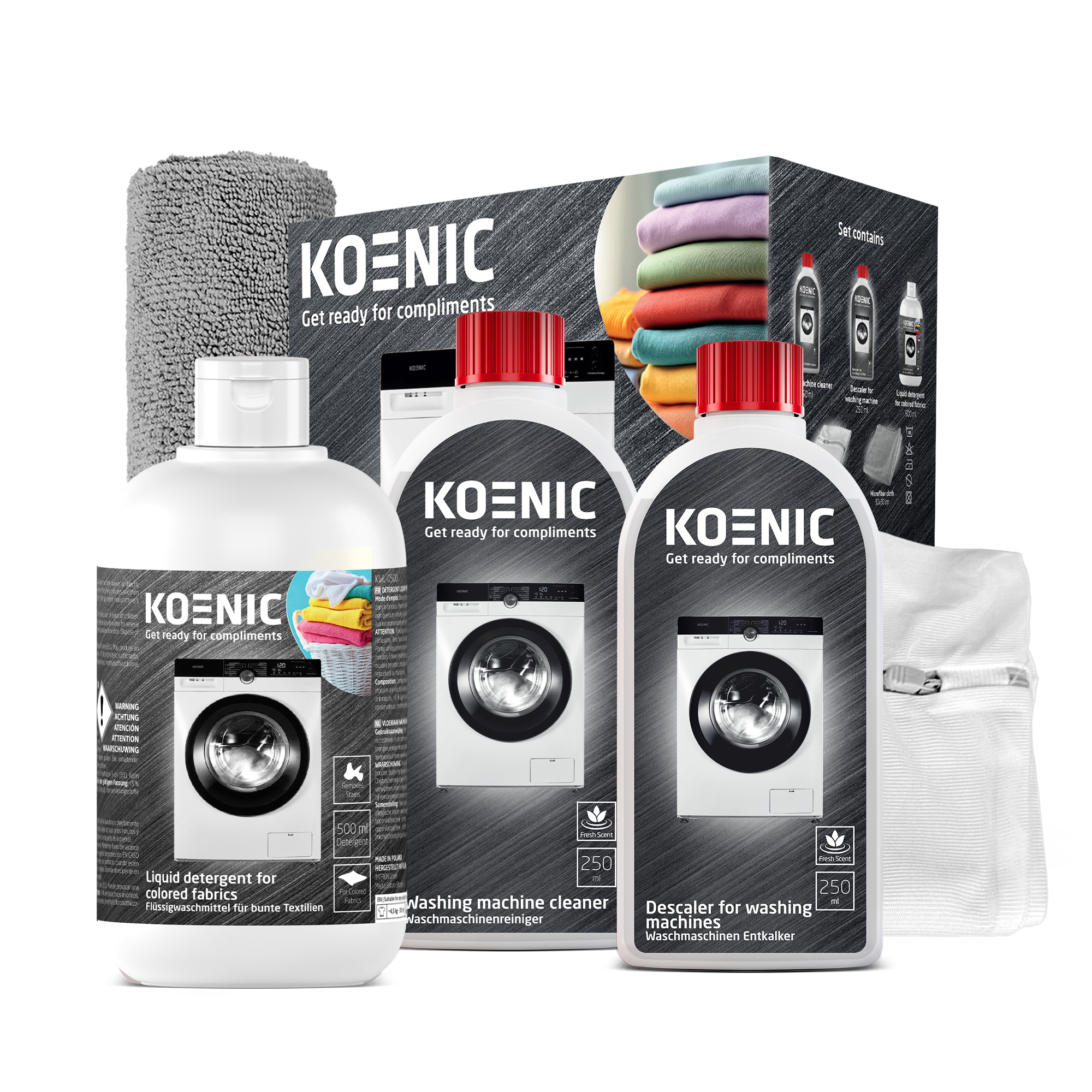 Entkalker für Waschmaschinen 250 ml, Waschmaschinenreiniger 250 ml, Flüssigwaschmittel für bunte Stoffe 500 ml, Dickes graues Mikrofasertuch, 30x30 cm (88 % polyester, 12 % nylon), Wäschenetz für Unterwäsche 25x30 cm