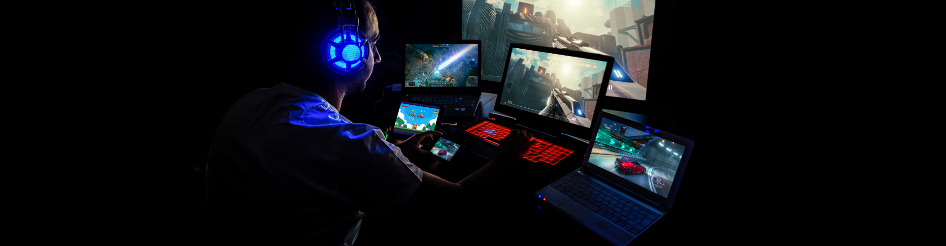 Ein Schreibtisch mit einem Monitor, einer Tastatur, Lautsprechern, Kopfhörern und einem Computergehäuse. Die Beleuchtung ist blau und rot.